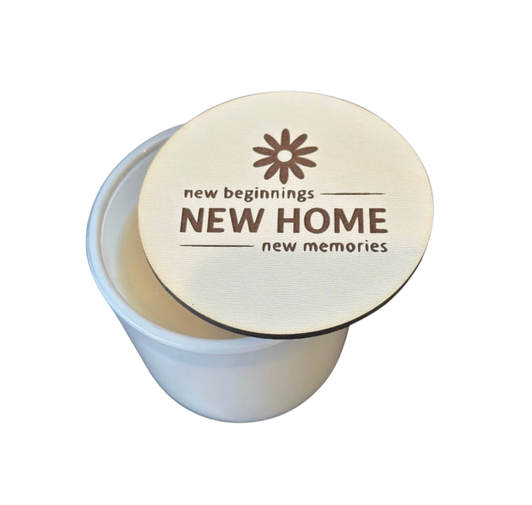 Personalized engraved new home candle gift with custom wood lid and clean, soy-free wax. A luxury keepsake for housewarmings, realtor closings, and meaningful new beginnings.